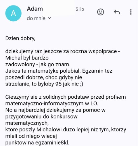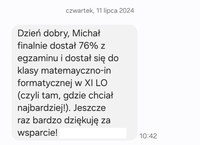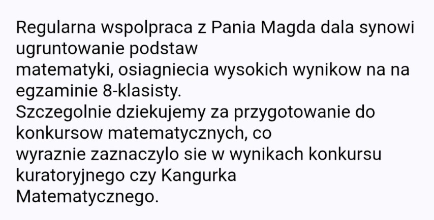 Pani Magdalena umie dotrzeć do ucznia, syn miał trójki w szkole, teraz dwa razy dostał szóstki ze sprawdzianu, próbny egzamin napisał na 86 procent.