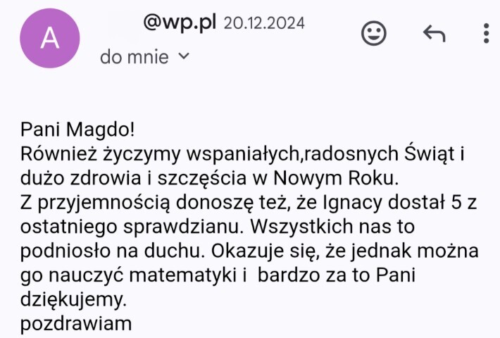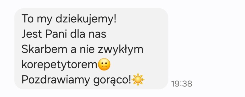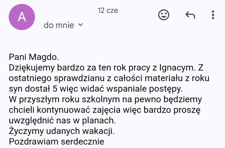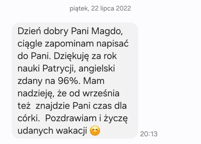 Jesteśmy zadowoleni z korepetycji z Panią Magdaleną. Lekcje przebiegają pomyślnie. Polecam!