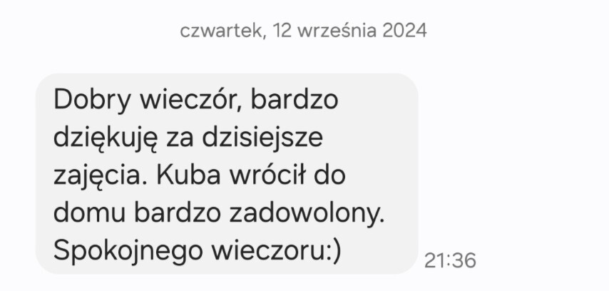 Jesteśmy bardzo zadowoleni z Pani Madzi, ma świetne podejście do dzieci, stosowna wiedzę, która bardzo skrupulatnie przekazuje synowi. Gorąco polecamy :)